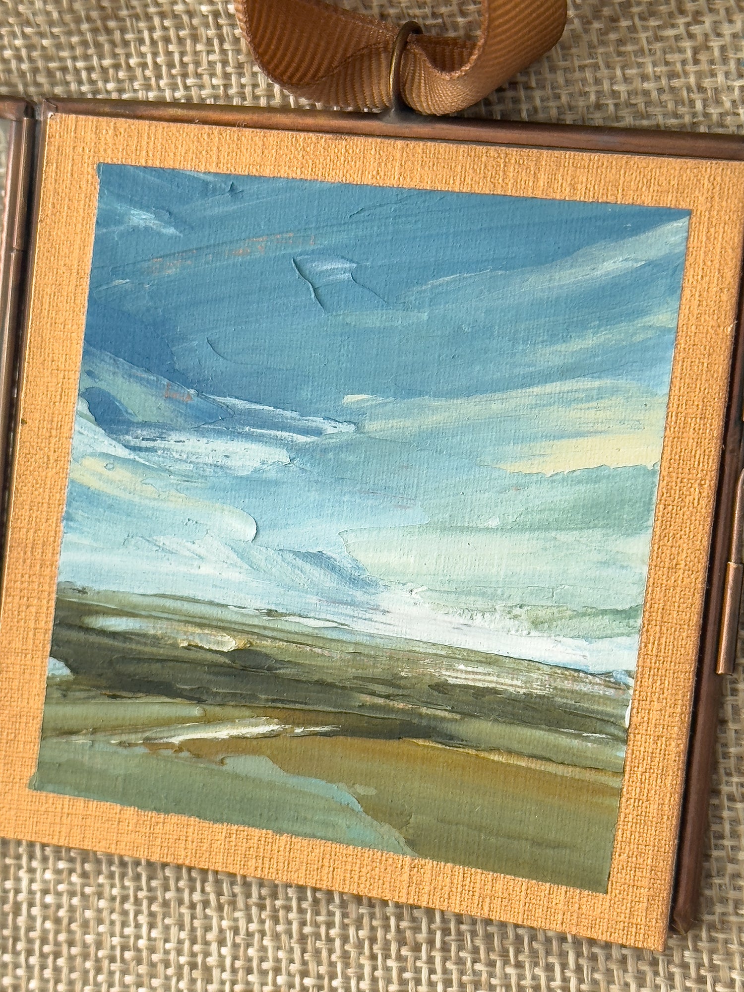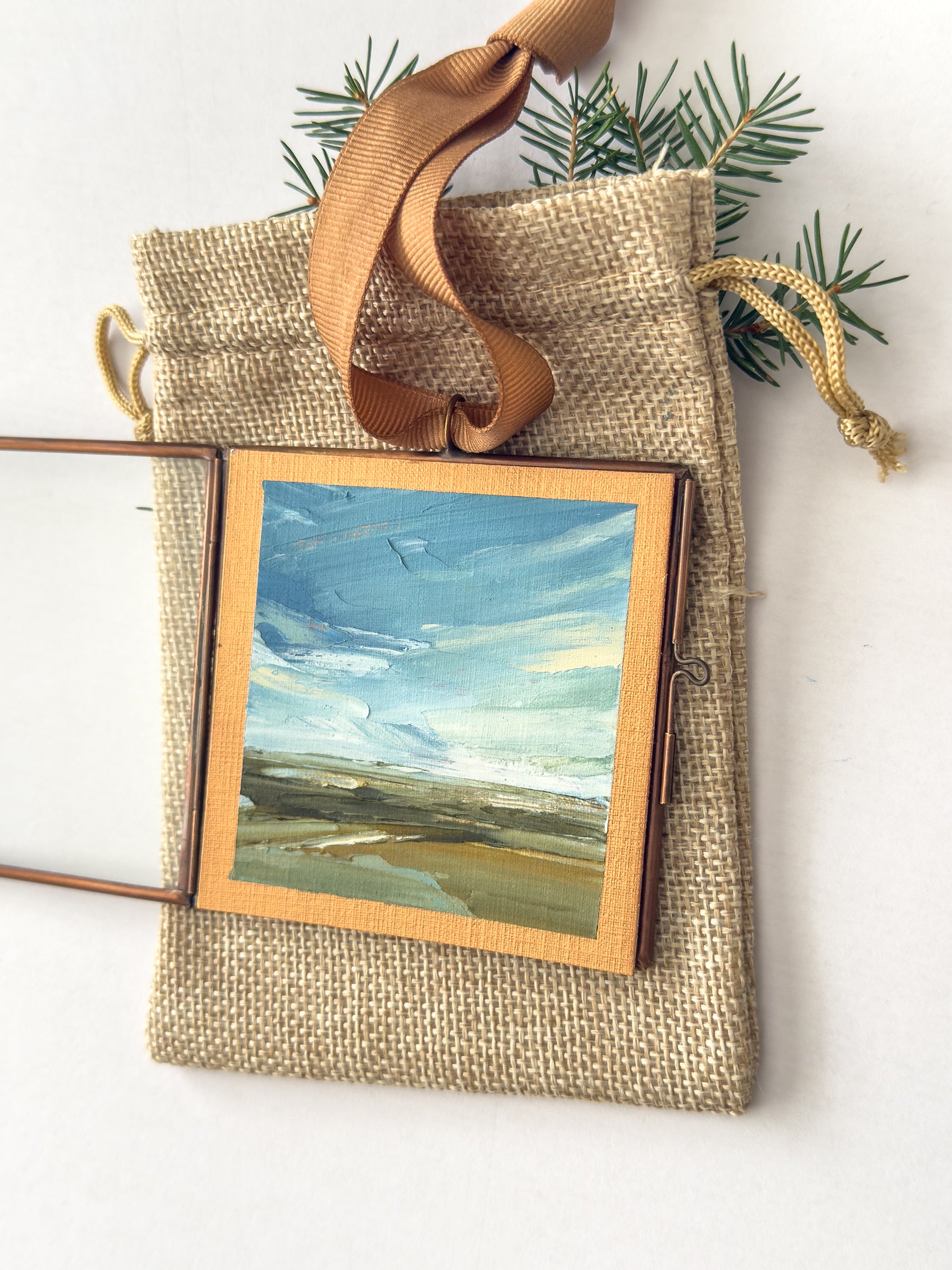 Each little ornament holds an original oil landscape painting, encased in an antique copper locket.